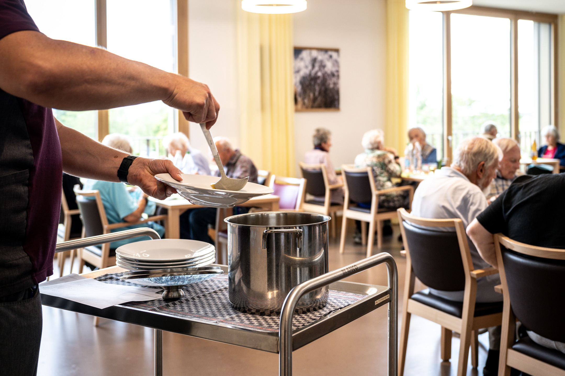 Im Geeren kocht ein motiviertes Küchenteam. Das Essen ist nicht nur abwechslungsreich, bekömmlich und gesund, sondern auch dekorativ angerichtet. Die Bewohnenden haben die Wahl zwischen verschiedenen Menüs und Kostformen. Das Essen wird am Tisch persönlich geschöpft und die Bewohnenden bestimmen, wie viel und was sie essen möchten.