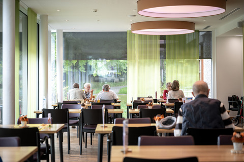 Im Alterszentrum können Angehörige und Bekannte jederzeit ein- und ausgehen und auch im Restaurant „Geerenpark“ oder im Sommer im Gartenrestaurant verweilen und sich kulinarisch verwöhnen lassen. Das Restaurant bietet sich auch für ein grösseres Essen mit Gästen oder für ein Geburtstags- oder Familien-Fest an.